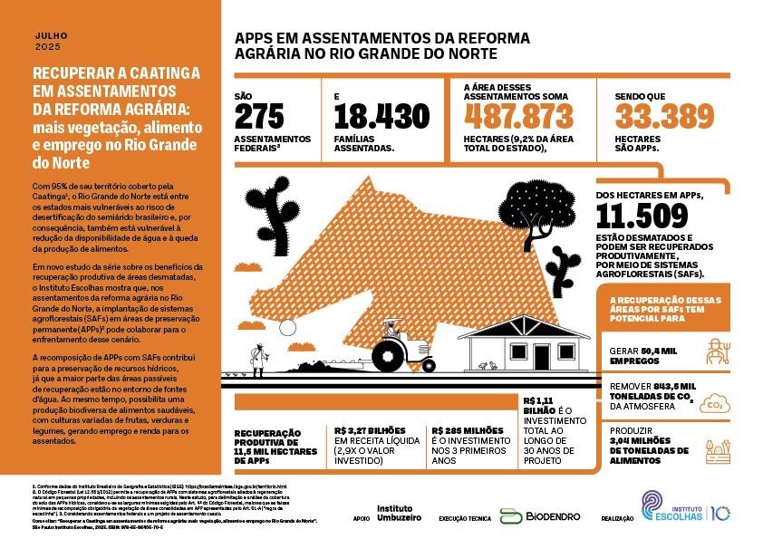 A pesquisa aponta que a recuperação de Áreas de Preservação Permanente (APPs) nesses assentamentos pode gerar R$ 3,27 bilhões em receita líquida para o Rio Grande do Norte, além de mais de 50 mil empregos, 3,04 milhões de toneladas de alimentos e a remoção de 843 mil toneladas de CO2 da atmosfera.