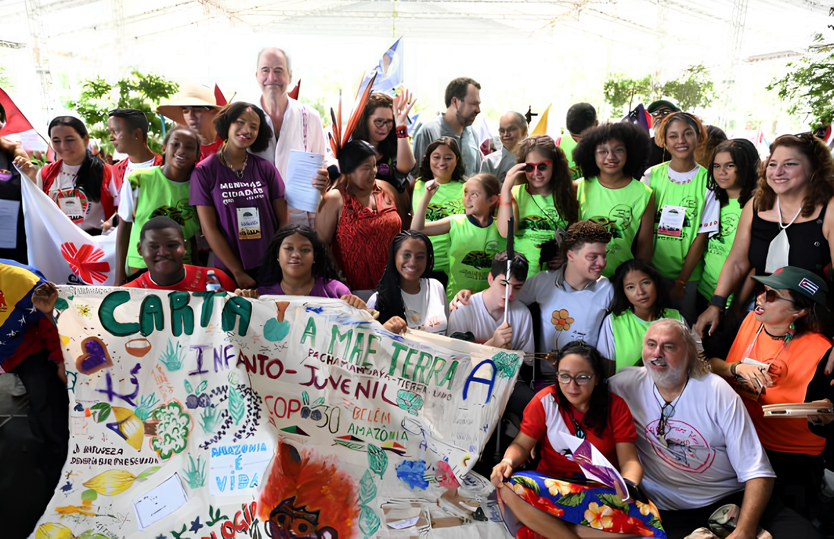 Em Belém, de forma inovadora, crianças como Georgina tiveram a oportunidade de acompanhar a programação da COP das Infâncias, com atividades específicas para que suas vozes pudessem ser ouvidas. Durante o encerramento da Cúpula dos Povos, no último dia 16, após intensa agenda de atividades da sociedade civil iniciadas no dia 12, crianças e jovens refletiram e emocionaram o público ao defenderem o futuro desejado, a partir das decisões políticas e diplomáticas que precisam ser tomadas no presente. Puderam, ainda, ler em público cartas com reivindicações diante de lideranças governamentais e do presidente da COP30, embaixador André Corrêa do Lago, que esteve acompanhado na ocasião pela CEO, Ana Toni.