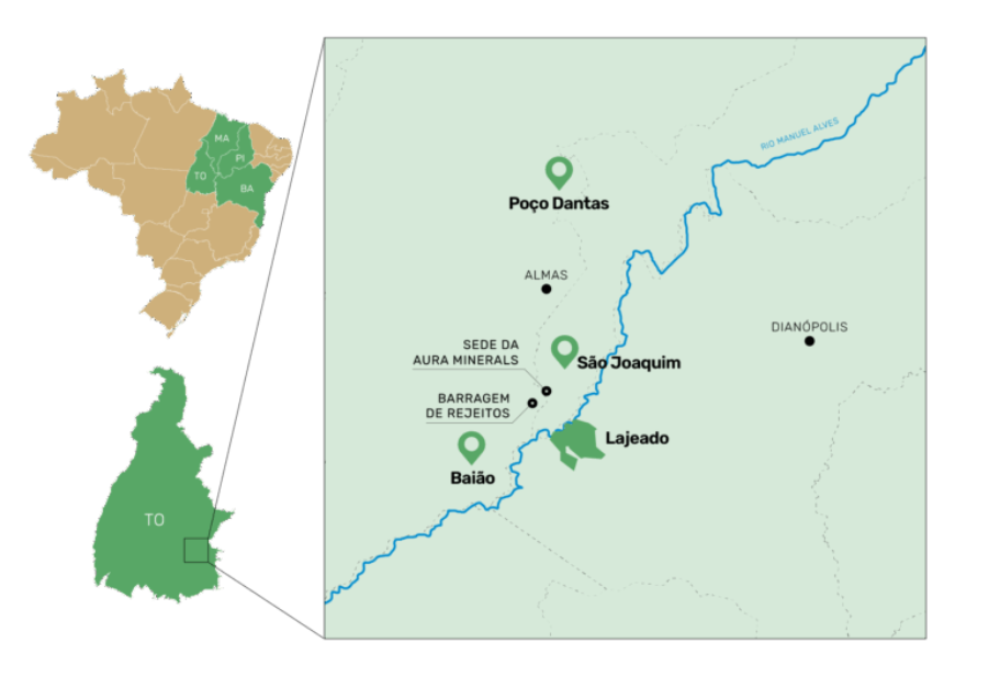 Além de desviar as águas do rio, a mina da Aura Minerals tem uma barragem de rejeitos sólidos localizada a 5,6 quilômetros da comunidade Baião, na área da nascente do córrego Riachão, principal fonte de água da comunidade.