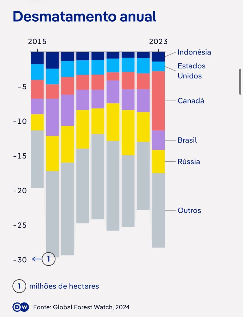 Nas últimas duas décadas, o montante anual de áreas verdes devastadas cresceu gradualmente. Rússia, Brasil e Canadá lideraram esse quesito em 2024.