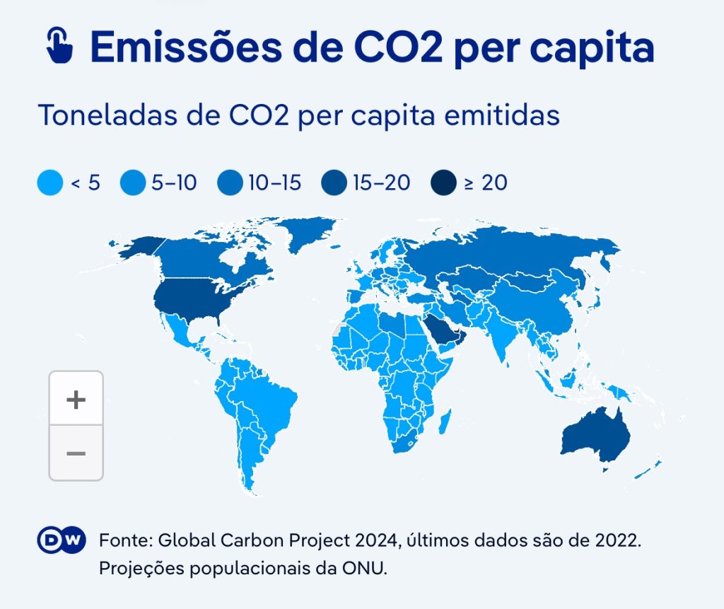 Se analisadas as emissões per capita de CO2, portanto, o quadro é muito diferente. Esse conceito, que faz uma média entre emissões e número de habitantes, coloca em evidência países ocidentais como os Estados Unidos e a Austrália, além de Rússia, Arábia Saudita, Omã, Catar e Mongólia.