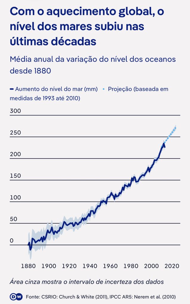 Conforme dados compilados pela Administração Nacional Oceânica e Atmosférica (NOAA), agência de pesquisa climática do governo dos Estados Unidos, o nível dos oceanos subiu em torno de 25 centímetros nos últimos 140 anos. Cerca de um terço desse aumento ocorreu apenas nos últimos 15 anos.