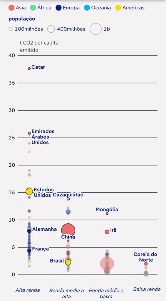 Se as nações forem agrupadas por renda (veja abaixo), há uma conexão entre níveis salariais mais altos e emissões per capita mais elevadas. Isso também revela como os países dentro de cada grupo são variados e que, quanto maior a renda, maior é o destaque entre todo o espectro de emissões.