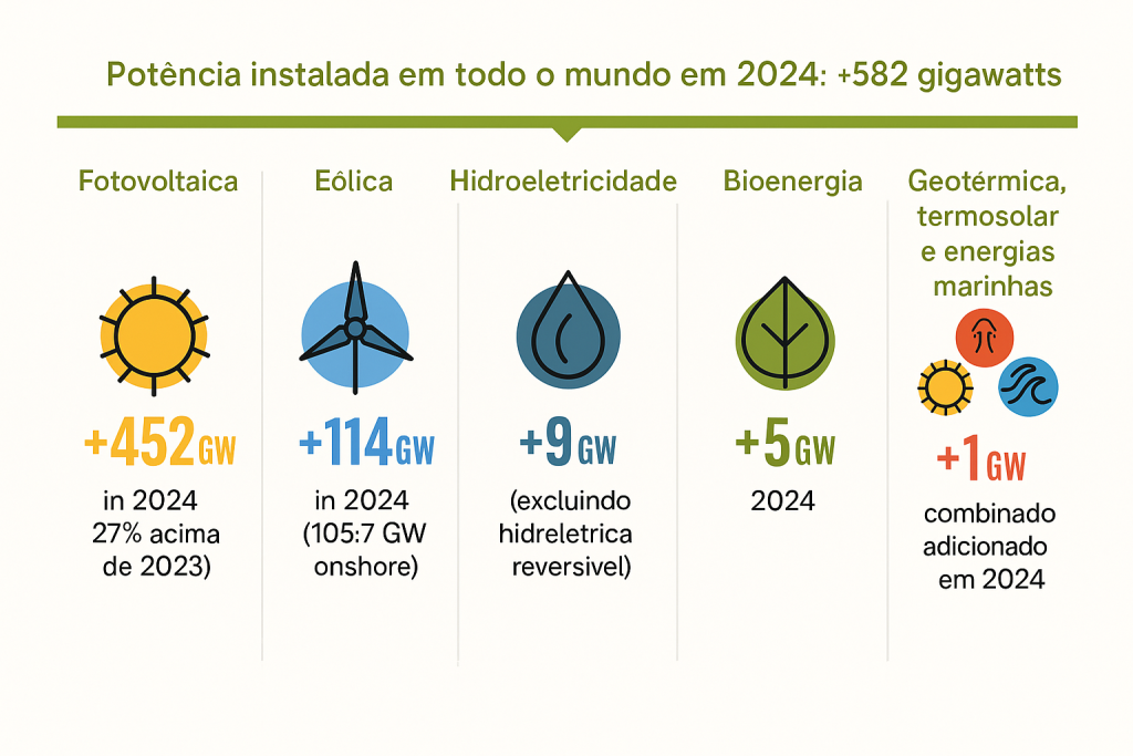 Em 2024, a capacidade instalada de fontes renováveis cresceu 582 gigawatts (GW) — o maior salto da história. Ainda assim, o número está muito aquém do necessário para alcançar o “Consenso dos Emirados Árabes Unidos”, que propôs triplicar a capacidade mundial até 11,2 terawatts em 2030.