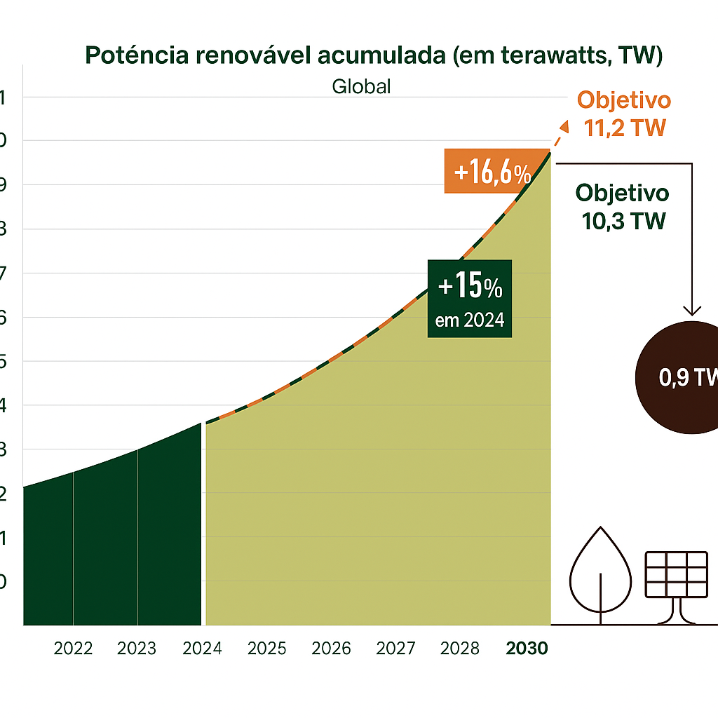 Para atingir esse objetivo, o planeta precisaria adicionar 1.122 GW por ano a partir de 2025 — o equivalente a acelerar o crescimento anual das renováveis para 16,6% ao longo da década.